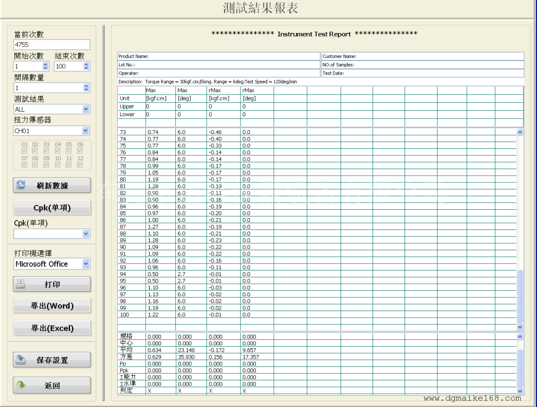2、可儲存及打印圖形(扭力-角度曲線圖、扭力衰減曲線圖、檢驗報表)。